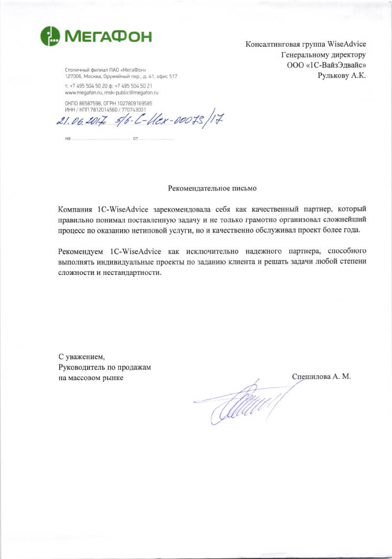 За год совместной работы компания 1С-WiseAdvice зарекомендовала себя надежным партнером. Благодарим руководство компании за индивидуальный подход и внимательное отношение, а также рекомендуем 1С-WiseAdvice в качестве провайдера бухгалтерских услуг.